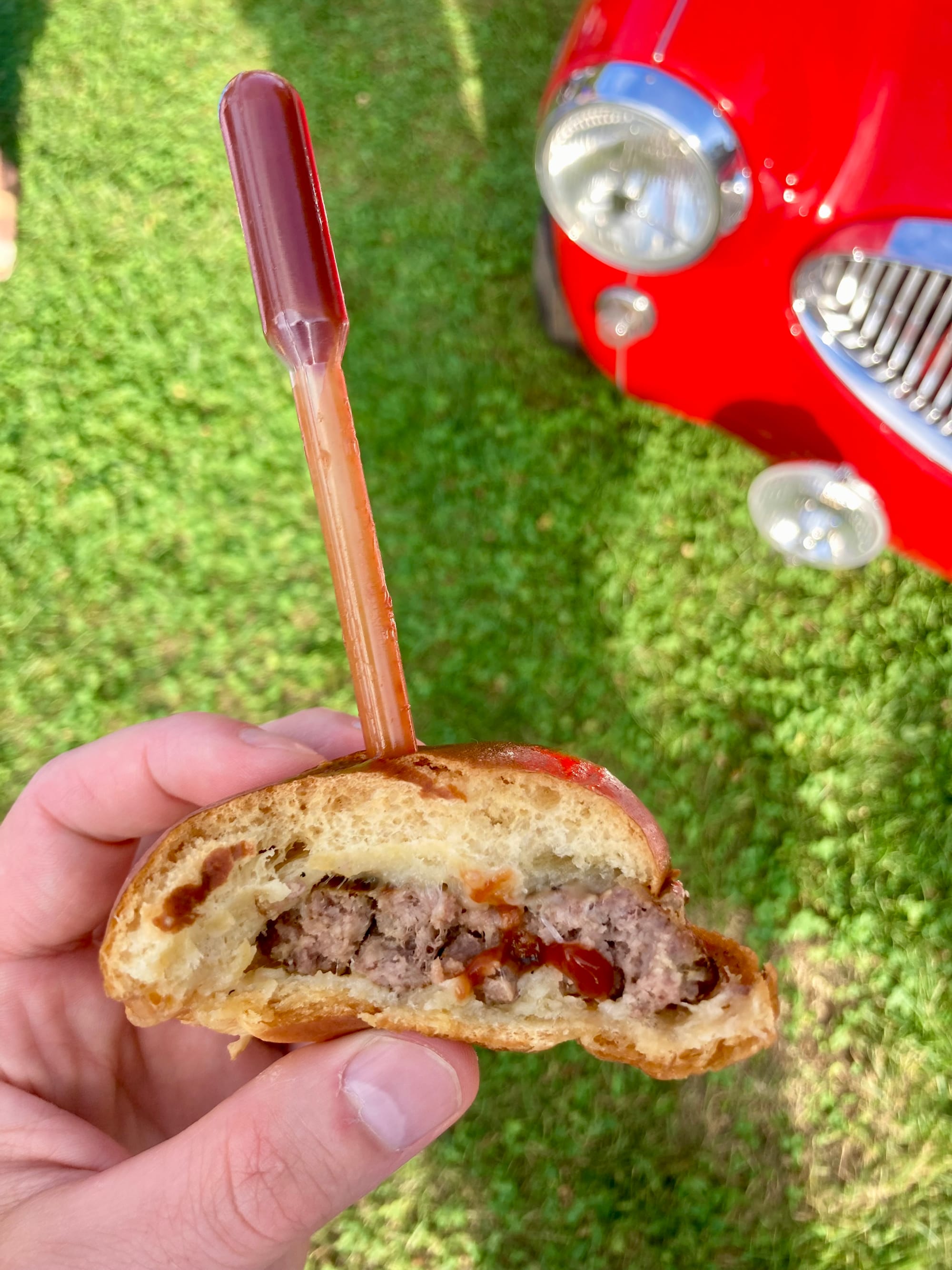 BBQ Pork Sliders with saucey pipettes for optimal saucing. My wife rehydrating between my 325iX and a Fly Yellow F360 Modena.